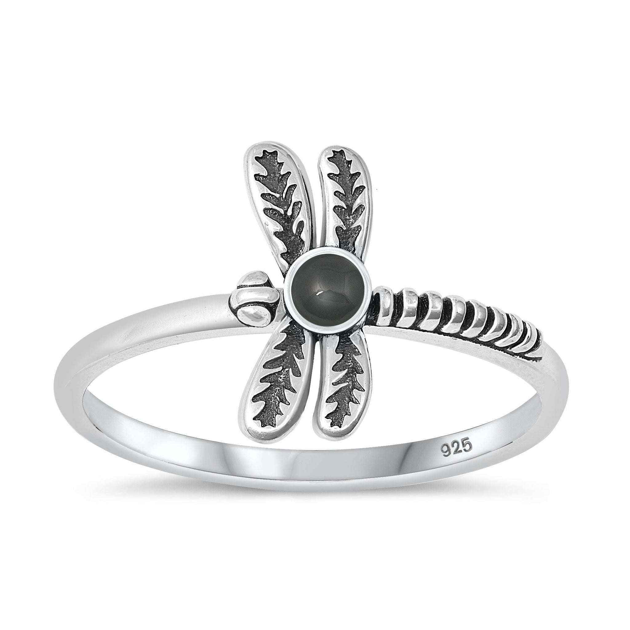 Sterling Silver Black Agate Dragonfly Ring