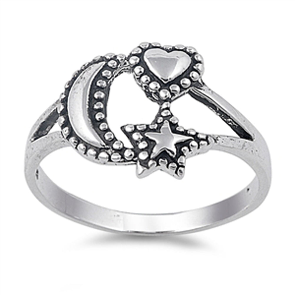 Oxidized Beaded Heart Moon Star Good Luck Ring Sterling Silver Band Sizes 4-12